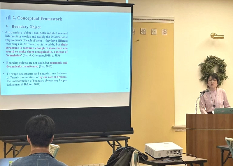 博士生张运吉作题为“跨文化课例研究中的知识跨界”的学术报告。该研究以“知识边界”(knowledge boundary)理论框架为依托,通过分析坦桑尼亚教师与上海教师的课后反思,深入揭示教师如何运用不同层次的方法逐步弥合文化差异带来的知识边界。研究结果凸显了进一步推进两种不同文化间有效转化的必要性,并为未来跨文化合作项目的规划提供了重要参考。