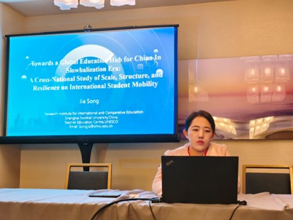 宋佳副教授在分论坛作“慢全球化时代下中国迈向全球教育枢纽:国际学生流动的规模、结构与韧性跨国研究”报告,采用跨国比较研究法,选取美、英、中、日、澳等主要留学目的国为样本,从规模、结构、韧性三大维度构建指标体系,依托国际教育协会等机构 2015-2024 年数据,通过量化分析与跨国对比,考察国际学生流动的数量特征、结构分布与抗风险能力。