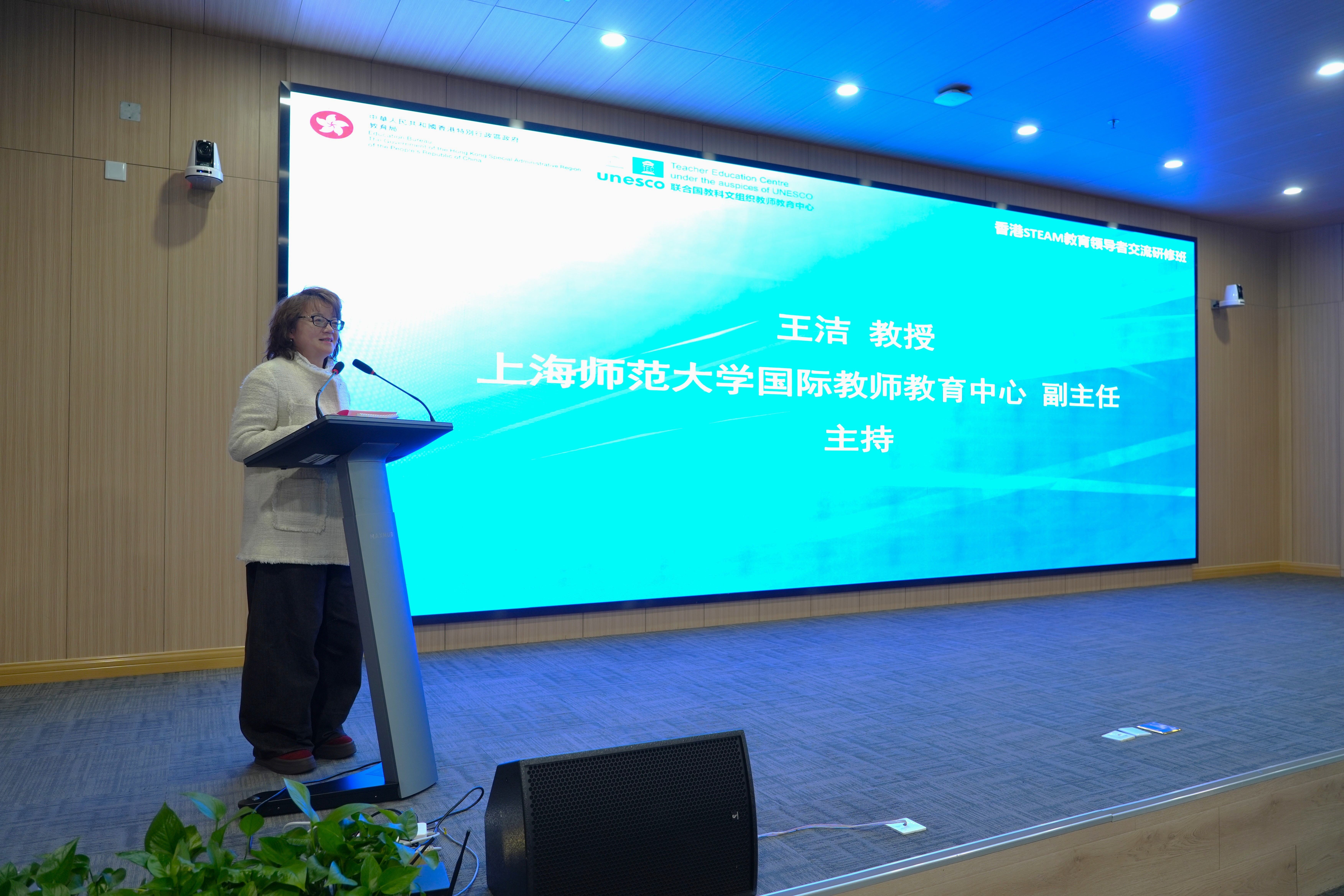王洁教授在致辞中表示,联教中心面向香港教师开设的专题培训班已迈入第二个年头。本次研修活动为香港各位教育同仁精心设计了为期一周的课程与交流安排,授课及分享嘉宾涵盖高校教授、政府部门负责人、博物馆及企业等各界专业人士,参访内容丰富多元。她希望,通过此次交流,沪港双方能够互学互鉴、共同提升,在充分展示上海教育实践成果的同时,积极借鉴香港教育的先进经验与有益做法,让各位香港教师学有所获、研有所得。