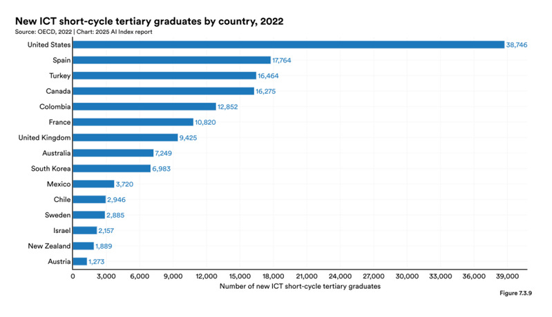 五是美国在培养信息通信技术(ICT)各学历层次毕业生方面持续领跑全球(如图5)。美国在副学士、硕士和博士层次的毕业生数量是排名第二国家的两倍有余,学士层次毕业生数量也接近其两倍。西班牙、巴西和英国在不同教育层级紧随其后,而土耳其则在实现ICT领域性别平等表现最为突出。