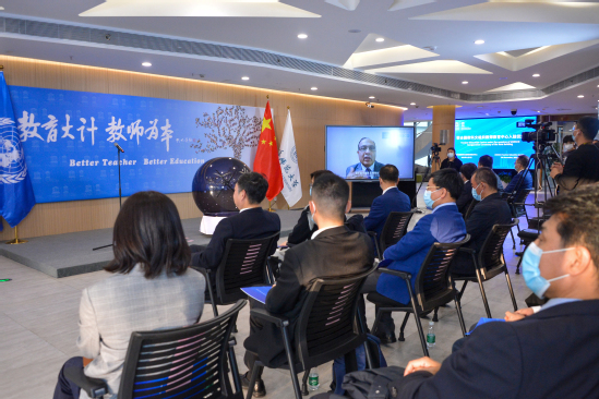 联合国教科文组织北京办事处主任夏泽翰(Shahbaz Khan)通过视频连线祝贺教师教育中心入驻全新的办公大楼。他指出,中心是联合国教科文组织全球唯一的教师教育相关多边合作机构,希望中心研究团队能在已有成果基础上,继续思考如何有效应对教师发展面临的全球性挑战。他表示,联合国教科文组织北京办事处将会继续全力支持中心的未来建设,在国家、区域和全球层面密切合作、推进教师教育变革议程。