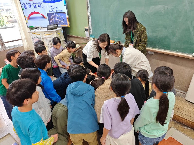 本期项目的主题为“构建友谊之桥 共话STEM教育”。14名研究生以“桥”为课程内容,分别设计了10堂跨文化STEM课堂。周佳颖和张云慧小组围绕“三角形稳定性”核心概念,引导日本小学生发挥创意搭建桥梁。石方圆、许苗和郑煣于小组则以《清明上河桥》中的叠梁拱桥为切入点,关联倍力桥原理,让学生们用木筷合作完成搭建任务。方帆、孙子微和刘青佩小组通过知识讲解、实验验证、动手制作三个环节,帮助学生们了解桥梁的分类、承重原理与结构特征,鼓励大家合作创新完成作品。韩洁琦、万军恺和庞正培小组通过引导小朋友分组制作桥梁,了解桥的连接作用并延伸探讨 “无形的桥梁”,帮学生理解桥的有形功能与无形意义。韦明芳、徐笑笑和崔子晨小组通过实验探究桥梁结构的力学原理,学生合作设计并制作一座“中日友好桥梁模型”,激发跨文化交流兴趣与团队协作能力。创意十足的课堂受到了日本学生的喜爱,日本京都教育大学附属学校的校长表示:“对贵校学生们认真投入的学习态度,以及大家所展示的课程内容深感钦佩。”课后,部分优秀桥梁作品被留在学校陈列展示,让此次跨文化教学实践的成果得以持续传递,成为中日学生友好交流的见证。