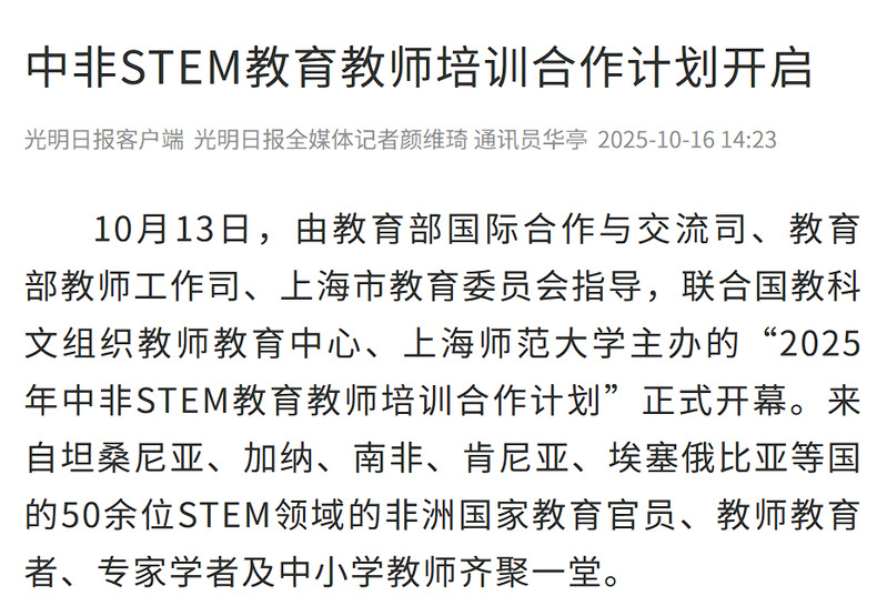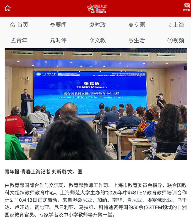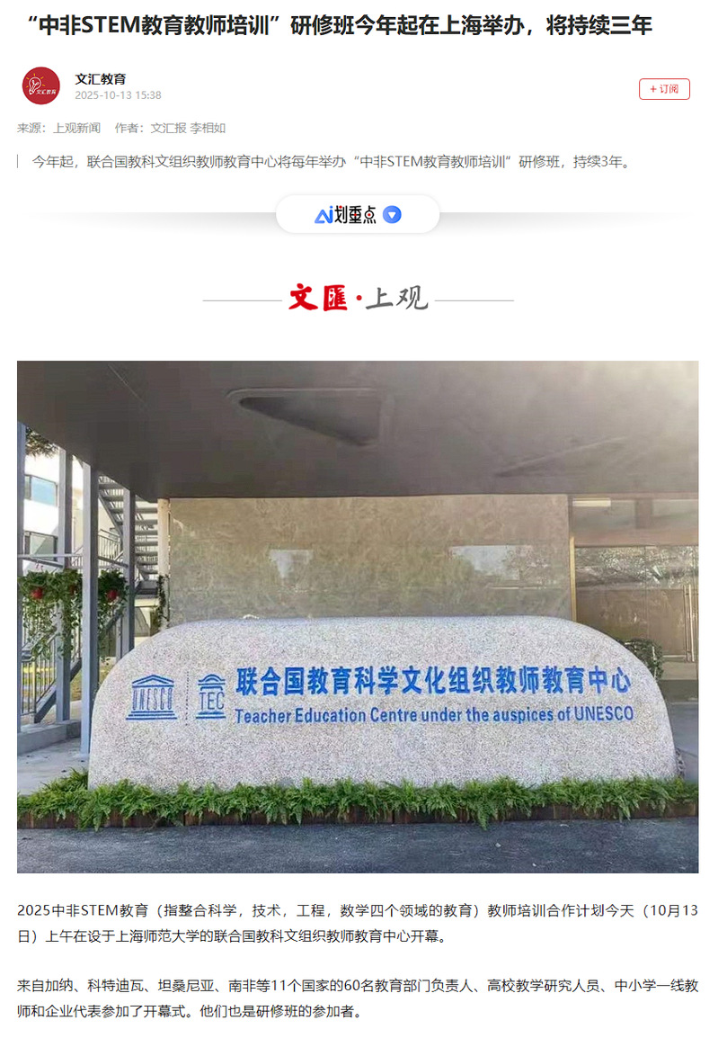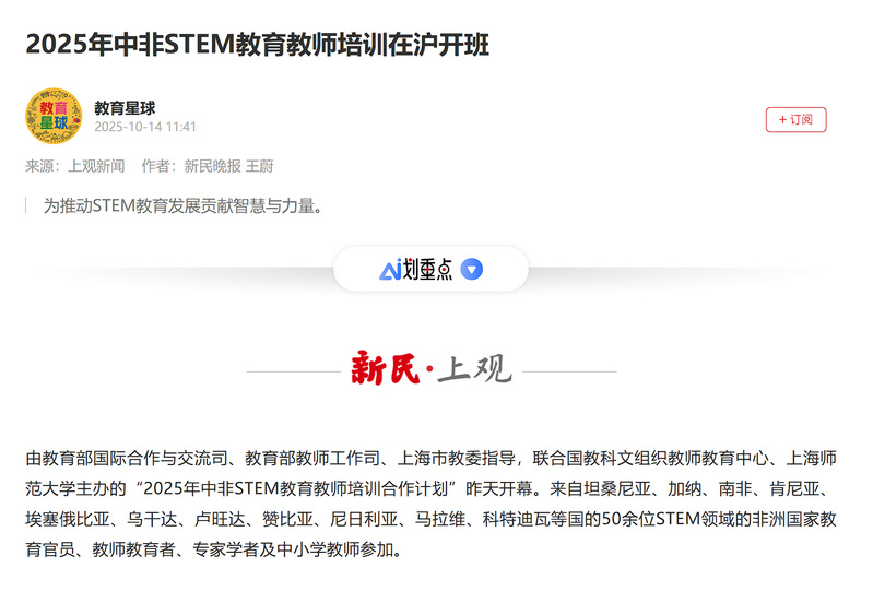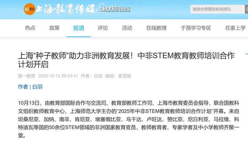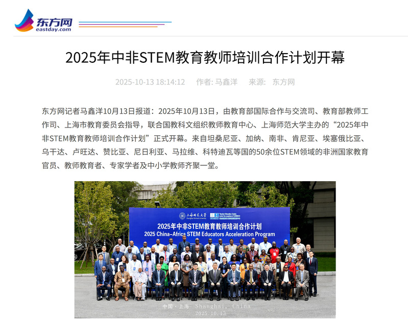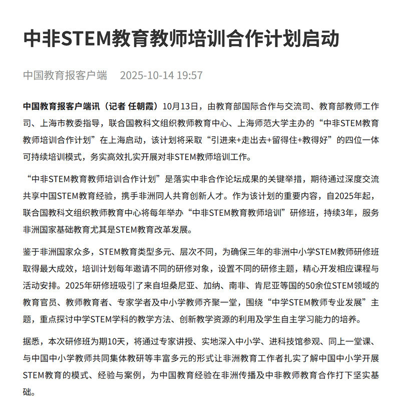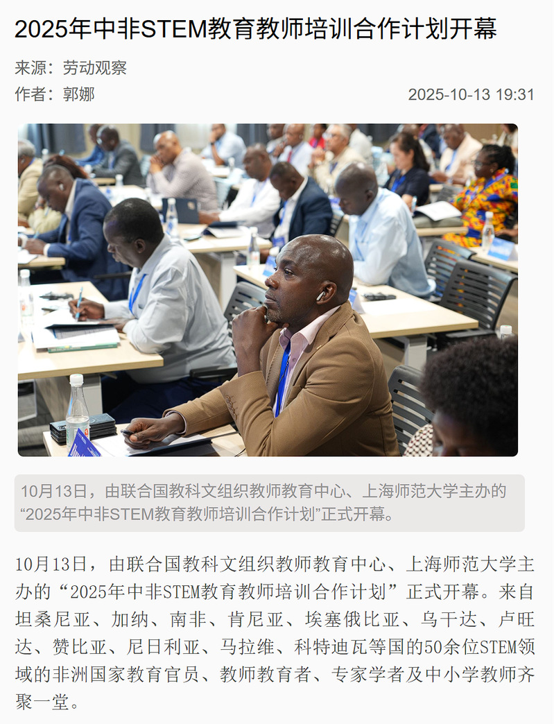 2025年10月12日至22日,联合国教科文组织教师教育中心、上海师范大学主办的“中非STEM教育教师培训合作计划”研修活动,获得国内中央级与地方媒体的广泛关注。