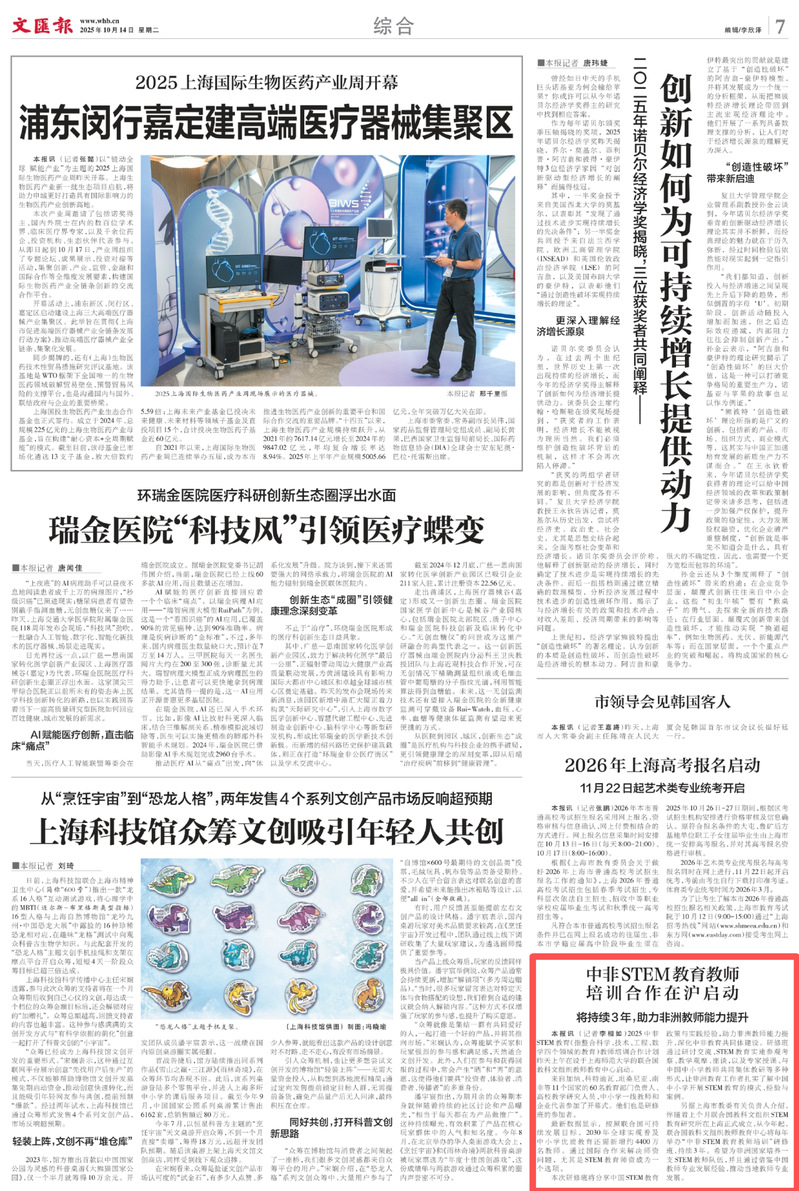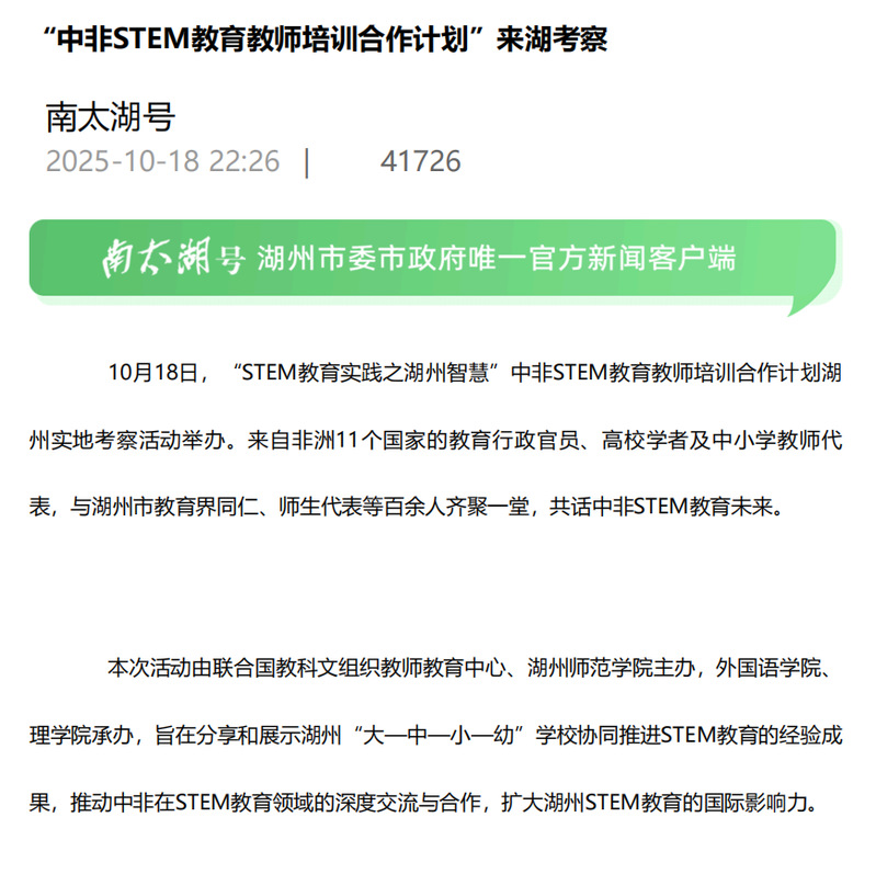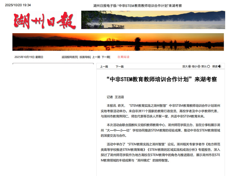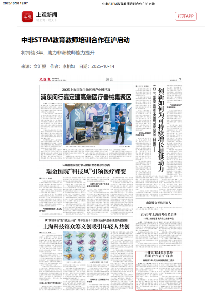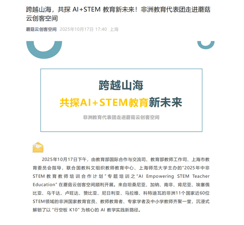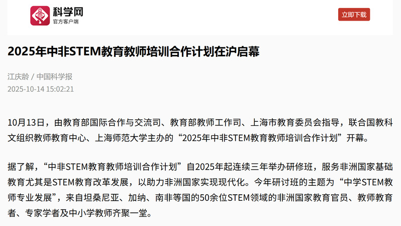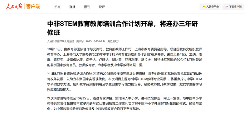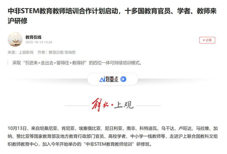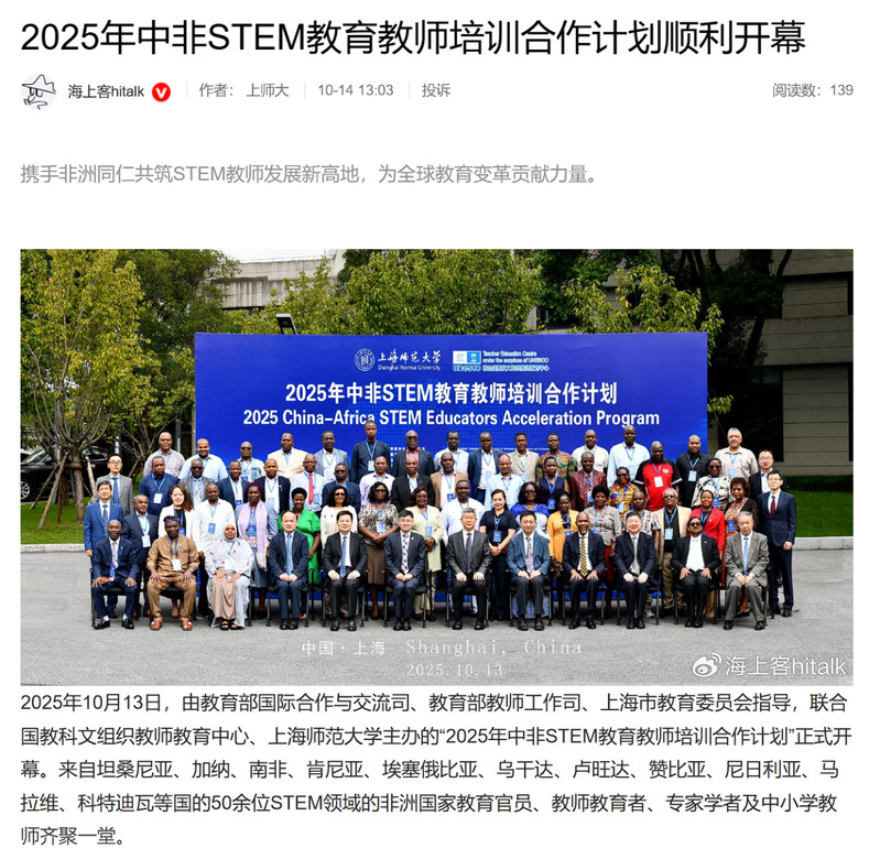 2025年10月12日至22日,联合国教科文组织教师教育中心、上海师范大学主办的“中非STEM教育教师培训合作计划”研修活动,获得国内中央级与地方媒体的广泛关注。