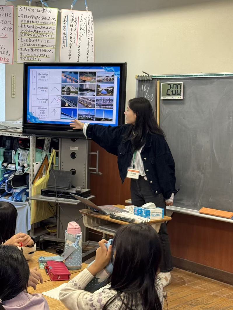 本期项目的主题为“构建友谊之桥 共话STEM教育”。14名研究生以“桥”为课程内容,分别设计了10堂跨文化STEM课堂。周佳颖和张云慧小组围绕“三角形稳定性”核心概念,引导日本小学生发挥创意搭建桥梁。石方圆、许苗和郑煣于小组则以《清明上河桥》中的叠梁拱桥为切入点,关联倍力桥原理,让学生们用木筷合作完成搭建任务。方帆、孙子微和刘青佩小组通过知识讲解、实验验证、动手制作三个环节,帮助学生们了解桥梁的分类、承重原理与结构特征,鼓励大家合作创新完成作品。韩洁琦、万军恺和庞正培小组通过引导小朋友分组制作桥梁,了解桥的连接作用并延伸探讨 “无形的桥梁”,帮学生理解桥的有形功能与无形意义。韦明芳、徐笑笑和崔子晨小组通过实验探究桥梁结构的力学原理,学生合作设计并制作一座“中日友好桥梁模型”,激发跨文化交流兴趣与团队协作能力。创意十足的课堂受到了日本学生的喜爱,日本京都教育大学附属学校的校长表示:“对贵校学生们认真投入的学习态度,以及大家所展示的课程内容深感钦佩。”课后,部分优秀桥梁作品被留在学校陈列展示,让此次跨文化教学实践的成果得以持续传递,成为中日学生友好交流的见证。