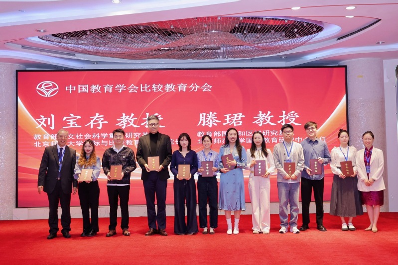 开幕式后,《比较教育研究》首届高水平共建“一带一路”教育研究青年学者征文一等奖获奖者名单公布,我院宋佳副教授和硕士生刘青佩合作撰写的文章《“一带一路”倡议下构建中非STEM教师教育合作新范式:基于非洲17国204份质性访谈的分析》荣获一等奖。中国教育学会比较教育分会理事长刘宝存教授,中国教育学会比较教育分会副理事长兼秘书长滕珺教授为获奖者颁发证书。