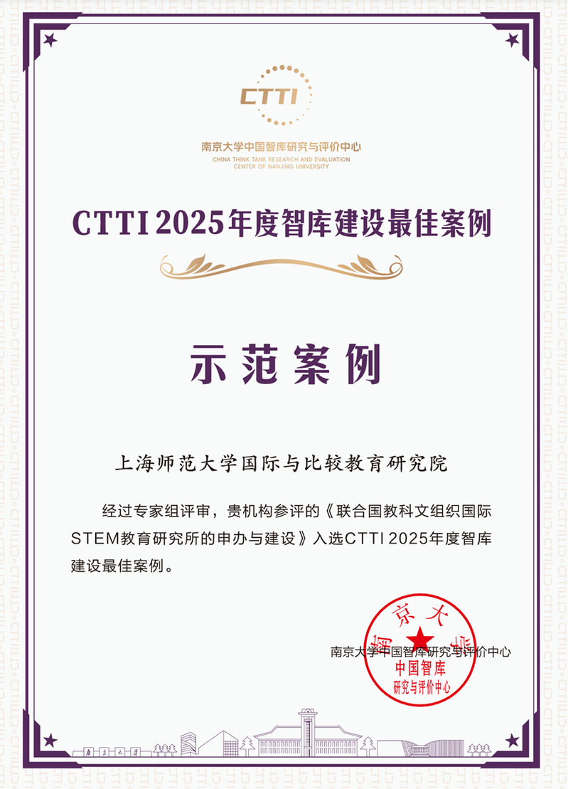 11月25日,南京大学中国智库研究与评价中心发布智库评选结果,研究院再次入选中国智库索引(Chinese Think Tank Index,CTTI)来源智库,并入选CTTI 2025高校智库百强榜,提交案例“联合国教科文组织国际STEM教育研究所的申办与建设”获评CTTI 2025年度智库建设示范案例。