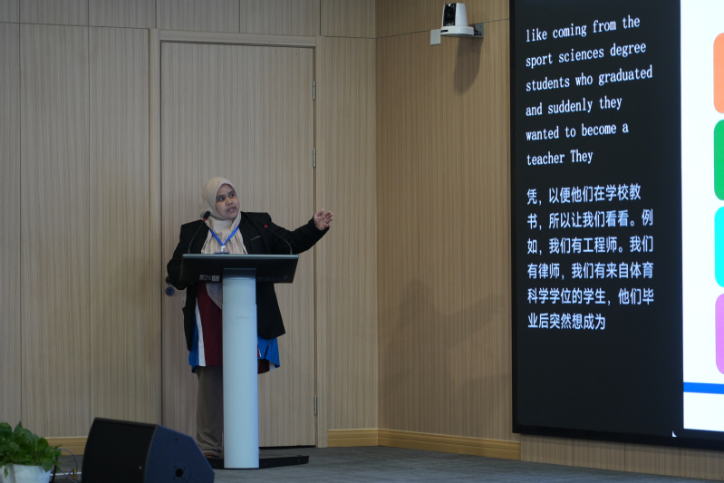 马来西亚马来亚大学STEM中心主任Mas Sahidayana binti Mohktar教授介绍了自 2018 年起STEM 中心在推动 STEM 教育、协调政企校合作的职能,梳理了马来西亚正规教师教育体系,详述了非正规教育的综合 STEM 模块、数字 AI 能力培训及跨学科团队教学模式。她同时阐释了 STEM-TVET 一体化培训核心,分享教师数字创新实践,强调多方协作对完善非正规培训体系的关键意义。